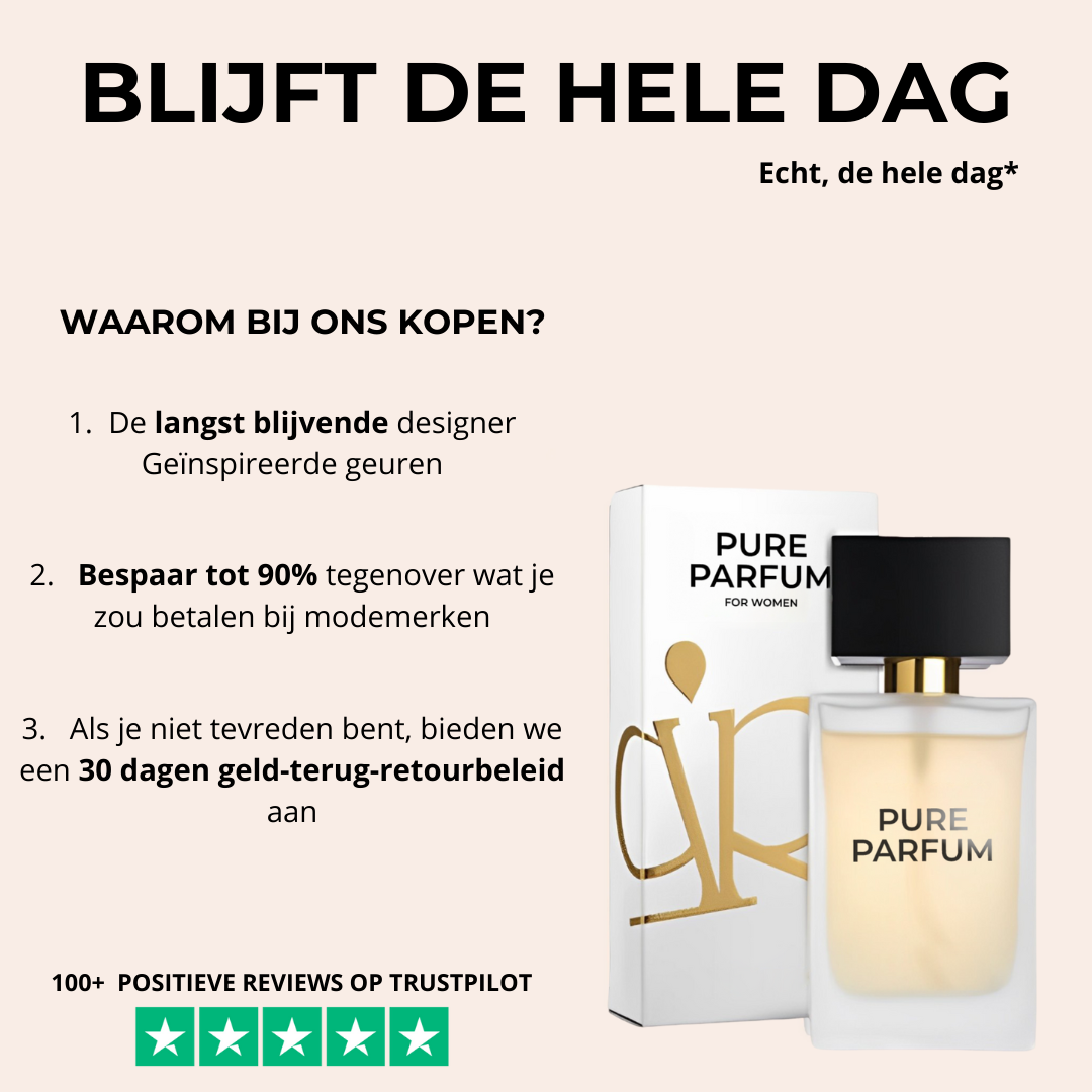 Onze producten zijn puur geïnspireerd op bestaande geuren en zijn niet ‘identiek’ aan enig ander parfum of origineel product. Pure Parfum dient niet te worden verward met originele merken en wij hebben geen enkele affiliatie met de fabrikanten van deze niet-genoemde designermerken.